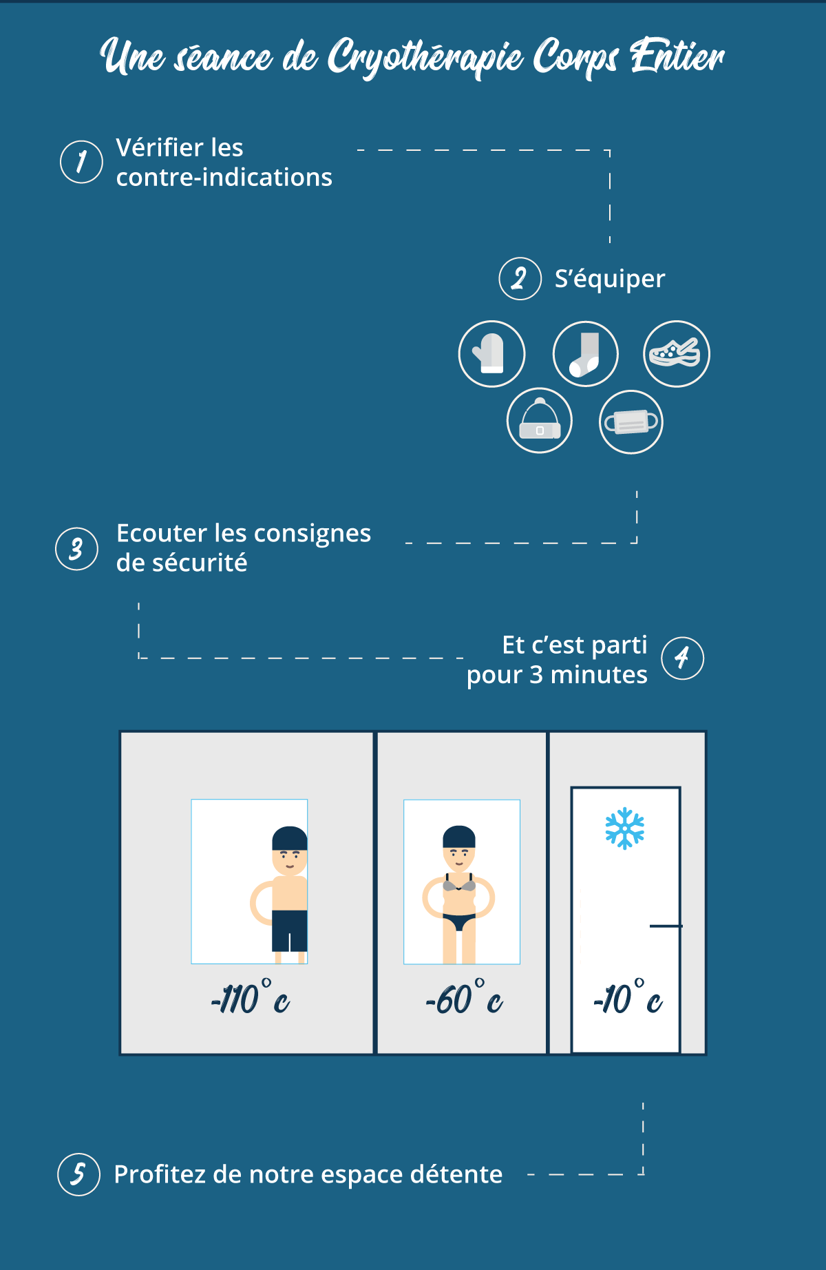 Vous vous posez des questions sur les séances de cryothérapie. Alors voilà comment elles se déroulent : une séance dans sa globalité dure 20 minutes. Nous vous demandons de venir avec un maillot de bain/sous-vêtements et chaussettes propres. Nous vous fournissons peignoir, gants, bandeau et chaussures.